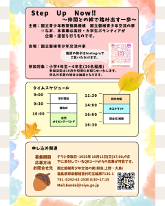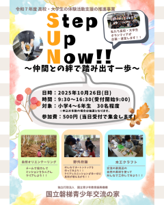 2025.09.252025.09.26イベント お知らせ10月26日(日)「Step Up Now!!」開催【募集案内】Step Up Now!!~仲間との絆で踏み出す一歩~(高校・大学生の体験活動⽀援の推進事業)開催のお知らせ〇開催日 2025年10月26日(日)〇対 象 小学4~6年生〇募集締切 2025年10月12日(日) 17:00〇申込方法 申込フォームよりお申し込みください。 【申込フォーム】